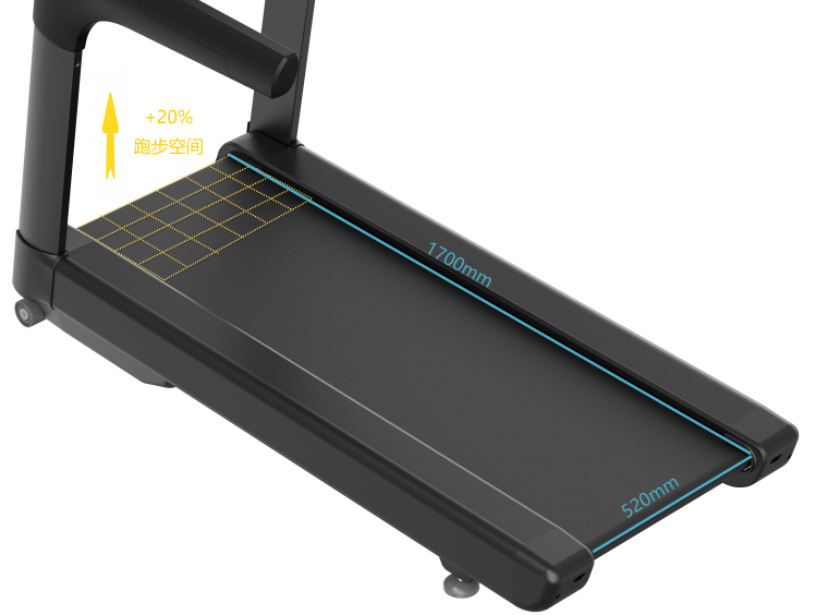 Utilizzando un design del motore montato in basso, il nastro da corsa si estende senza soluzione di continuità su tutto il piano, migliorando notevolmente l'utilizzo del nastro. Questo approccio innovativo aumenta lo spazio di corsa del 20%, fornendo un'area estesa di 520 mm × 1700 mm per un'esperienza di corsa libera e piacevole.